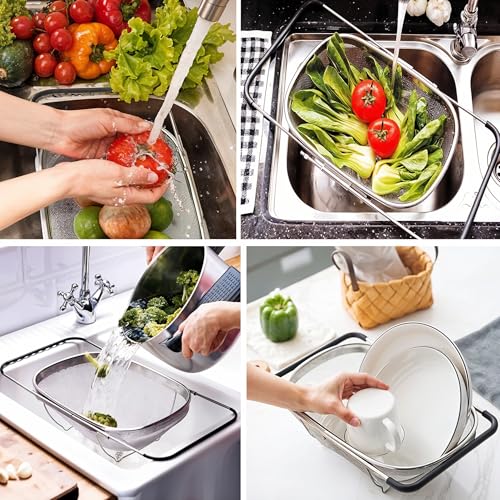 - تشغيل بدون استخدام اليدين - يمكن لهذه السلة القابلة للتعديل للحوض القيام بأعمال أخرى عن طريق وضعها على الحوض. يقف بمفرده ولا يسقط. لا حاجة لحملها بيديك أثناء غسل الخضروات أو تصفية البقول