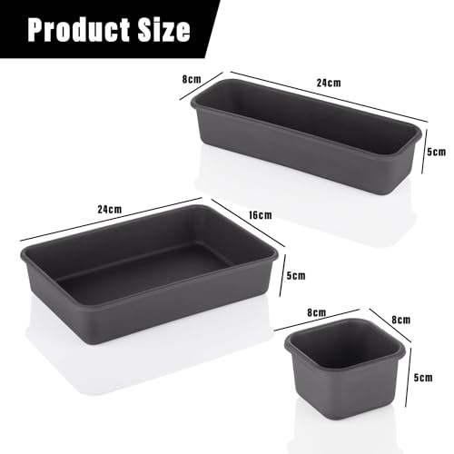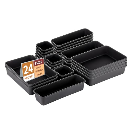 - ✅ منظم تخزين للأدراج (24 قطعة) | اللون - أسود غير لامع | المادة - بلاستيك | أبعاد المنتج - 6 قطع كبيرة - 24 سم × 16 سم × 5 سم | 9 قطع مقاس M - 24 سم × 8 سم × 5 سم | 9 قطع صغيرة - 8 سم x 8 سم x 5 سم
