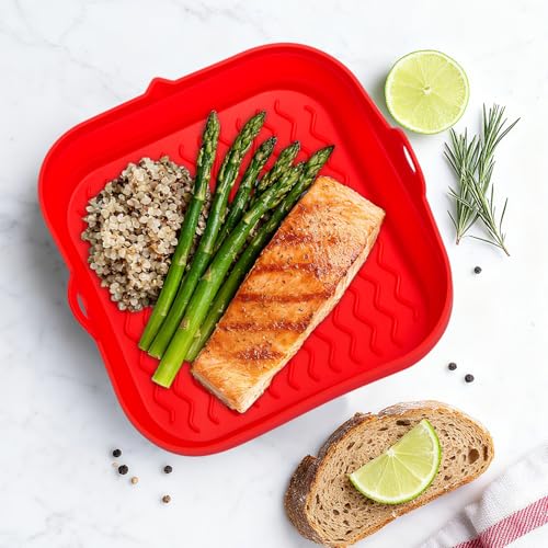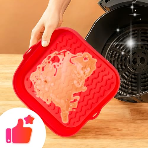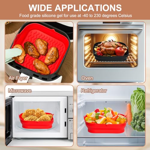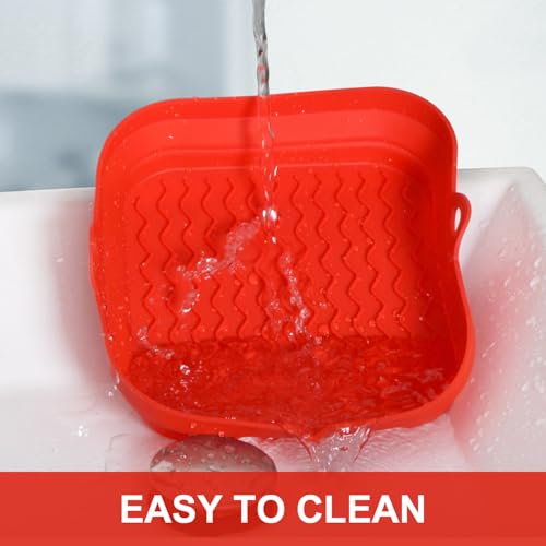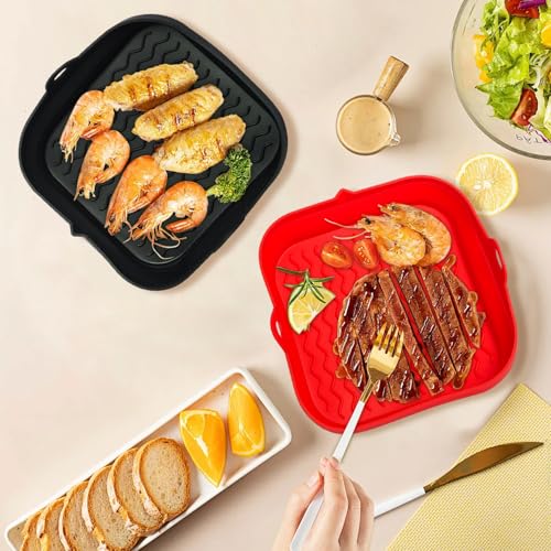 KUILONGT - بطانات مقلاة هوائية مربعة من السيليكون قابلة لاعادة الاستخدام وقابلة للطي وامنة للاستخدام في غسالة الصحون وقابلة للتكديس للمقلاة الهوائية من كويلونغت، عبوة من قطعتين، لون احمر وواحد اسود)