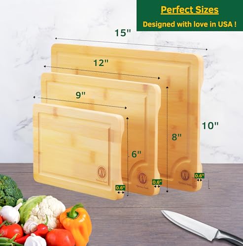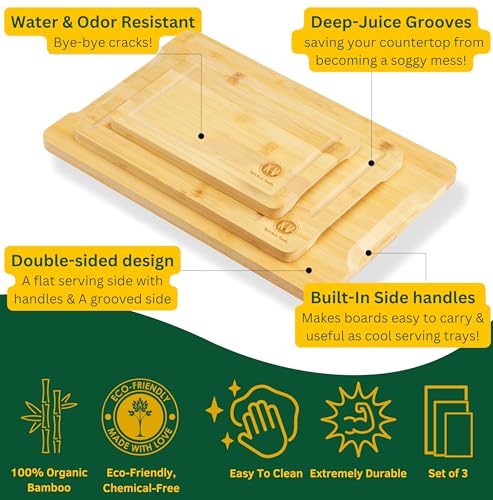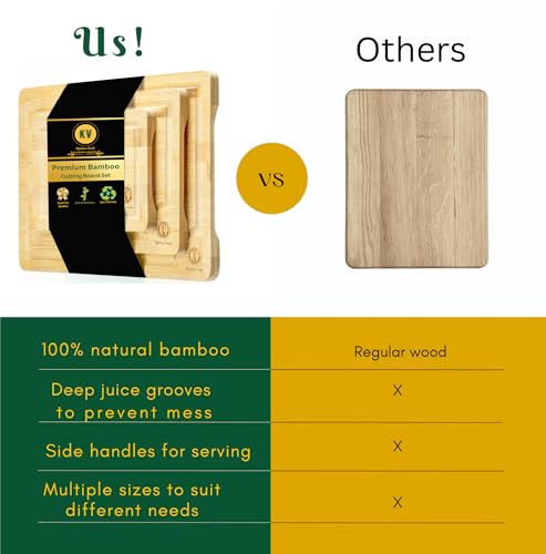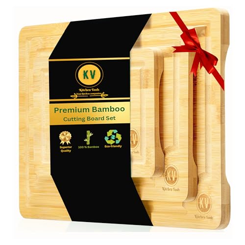 KV Kitchen Tools - لوح تقطيع من الخيزران للمطبخ - لوح تقطيع من الخشب مع تجويف عميق للعصير واللحوم والخضروات - مجموعة ألواح تقطيع صغيرة ومتوسطة وكبيرة الحجم من 3 قطع - لوح تقطيع وصينية تقديم من الخشب لمستلزمات المطبخ