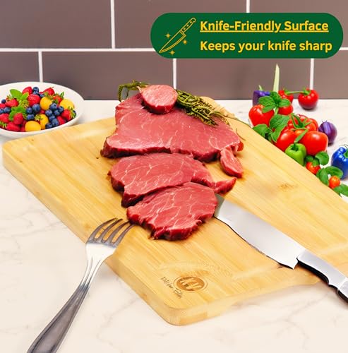 - سطح أملس وآمن للسكين: ألواح التقطيع المصنوعة من خشب الخيزران مصنوعة من مادة صلبة للغاية، والتي ستتجنب تلف سكاكينك وتحافظ على حدة السكاكين. تتميز ألواح التقطيع الخاصة بنا بسطح أملس يمنع التسبب في الحوادث في المطبخ ويمنحك تجربة إيجابية.