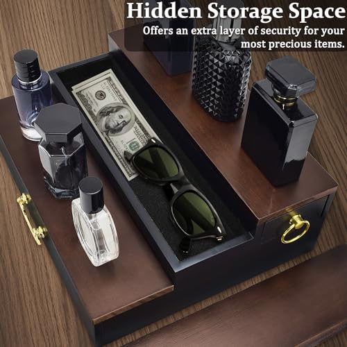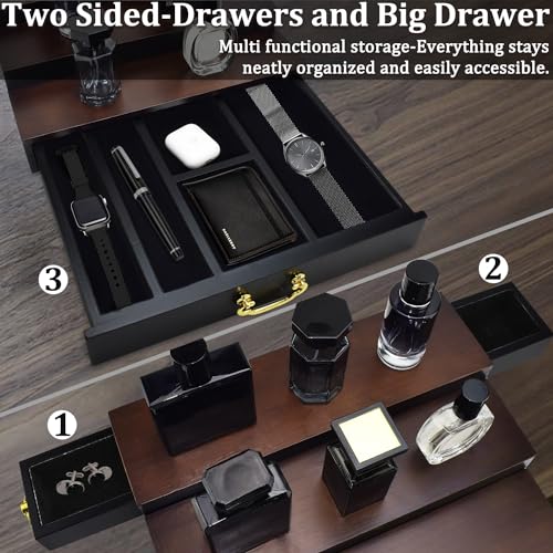 - 【حامل كولونيا خشبي مكون من عدة أدراج ومساحة تخزين مخفية】منظم الكولونيا هذا لا يتعلق فقط بالحفاظ على عطورك منظمة؛ إنه حل تخزين متعدد الاستخدامات ومصمم لتلبية احتياجات الرجل العصري. يوفر الدرج الكبير والدرج الأصغر مساحة واسعة لتنظيم ساعاتك واكسسواراتك وغيرها من الضروريات بدقة. بالإضافة إلى ذلك، يوفر الدرج المخفي طبقة إضافية من الأمان لأغلى أغراضك الثمينة، مما يجعله حل تخزين مثالي للمجوهرات العزيزة والتذكارات الشخصية. من الساعات إلى المحافظ والسلاسل إلى الولاعات، حافظ على ضرورياتك في متناول اليد ومنظمة بشكل لا تشوبه شائبة.