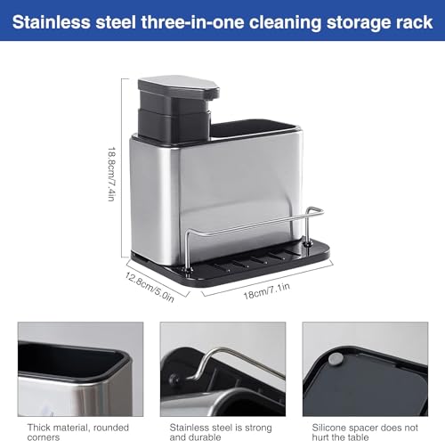 - 【تصميم 3 في 1】هل ما زلت قلقًا بشأن الترتيب غير المنظم لإسفنجات الأطباق والفرش وموزع الصابون؟ موزع صابون الأطباق لحوض المطبخ مناسب لحمل الإسفنج والصابون والفرش والأواني الأخرى. مع عيار كبير، يمكنك إعادة ملء الصابون في علبة حوض المطبخ هذه بسرعة. يمكن لمنظم حوض المطبخ الصغير المصنوع من الستانلس ستيل توفير مساحة كبيرة لسطح الطاولة. (الإسفنج والفرشاة غير متضمنين)