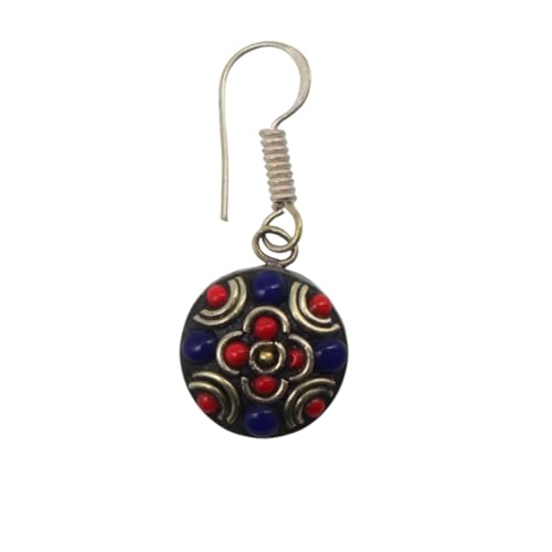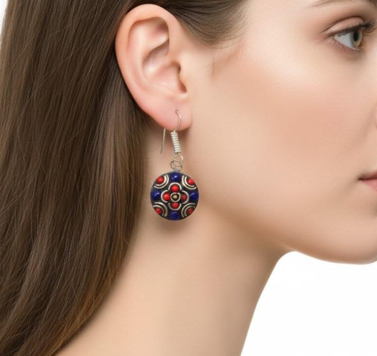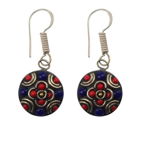 Indian Stones MA - حلق حريمي فاخر من الفضة المخلوطة بالنحاس اقل من العيار مرصع بأحجار طبيعية كريمة من لابس لازولي والمرجان - ازرق احمر E15
