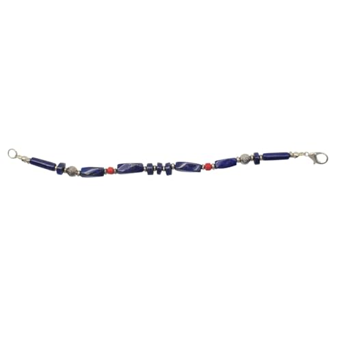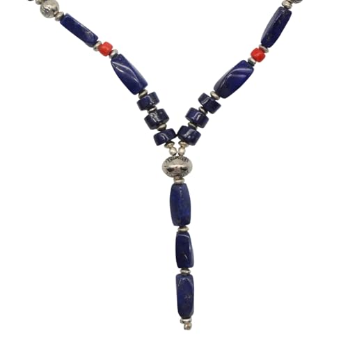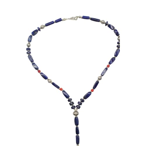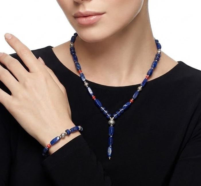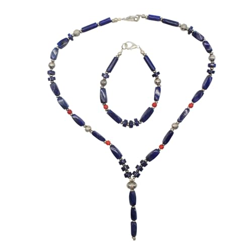 Indian Stones MA - طقم عقد وانسيال هندي فاخر من الفضة المخلوطة بالنحاس اقل من العيار مرصع بأحجار طبيعية كريمة من لابس لازولي والمرجان، قطعتين - ازرق احمر Set-1-C