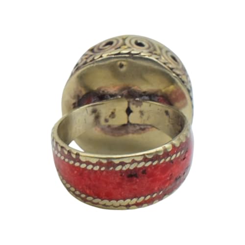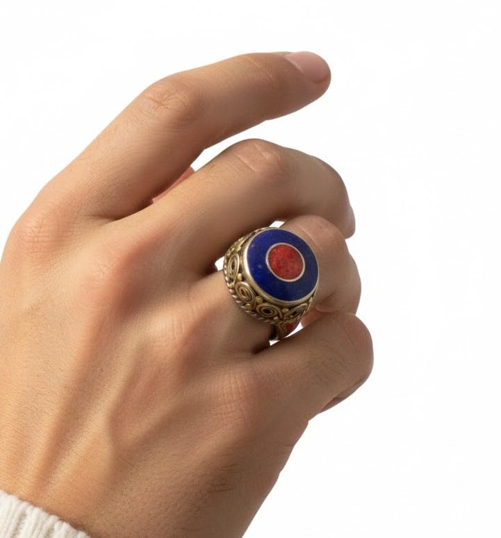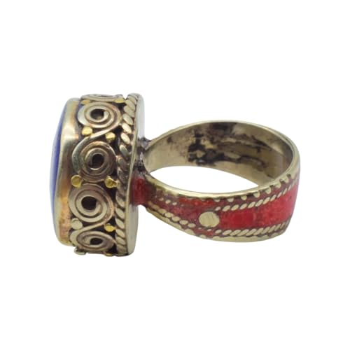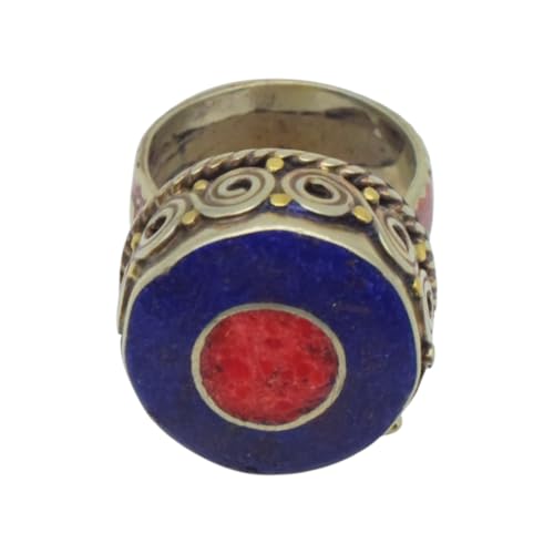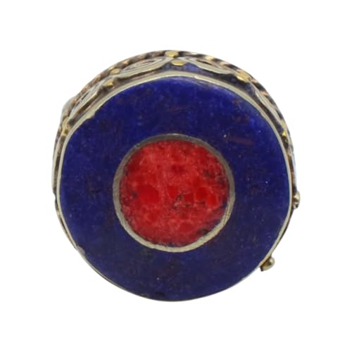 Indian Stones MA - خاتم حريمي فاخر من الفضة المخلوطة بالنحاس اقل من العيار مرصع بأحجار طبيعية كريمة من لابس لازولي والمرجان، مقاس واحد - ازرق احمر R31