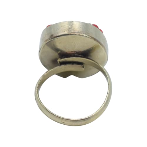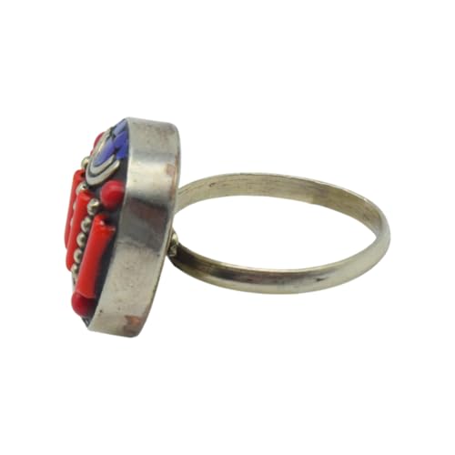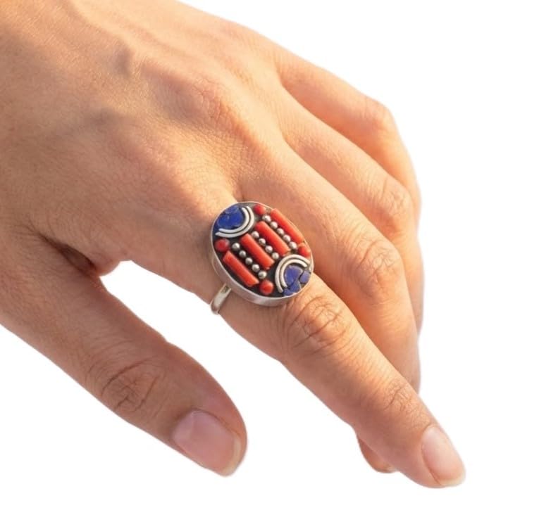 Indian Stones MA - خاتم حريمي فاخر من الفضة المخلوطة بالنحاس اقل من العيار مرصع بأحجار طبيعية كريمة من لابس لازولي والمرجان، مقاس واحد