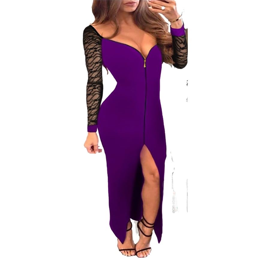 Generic - فستان لانجيرى طويل باكمام دانتيل و سوستة من الامام ، للنساء