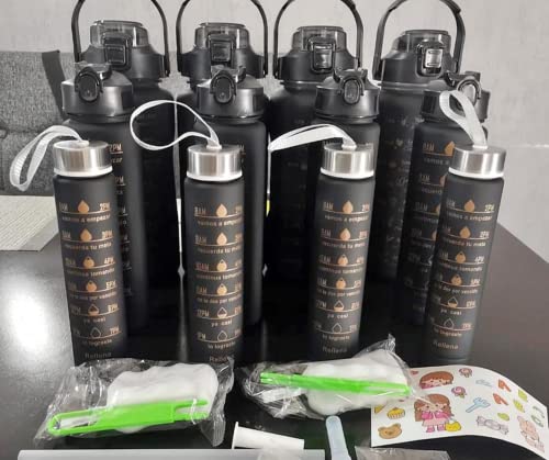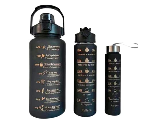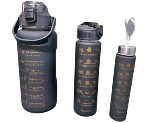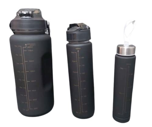 Spaceshoop - مجموعة زجاجات رياضية تحفيزية من لاجونا جادجيتس من 3 قطع، خالية من BPA، قارورة تحفيزية، سعة كبيرة، 2 لتر + 990 مل + 330 مل، 3 قطع، اسود وذهبي، زجاجات لصالة الالعاب الرياضية