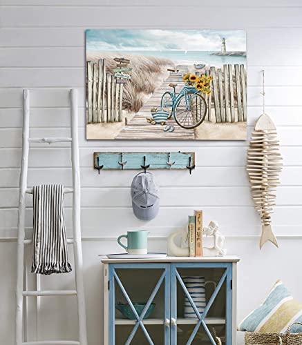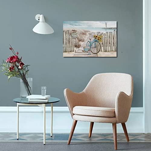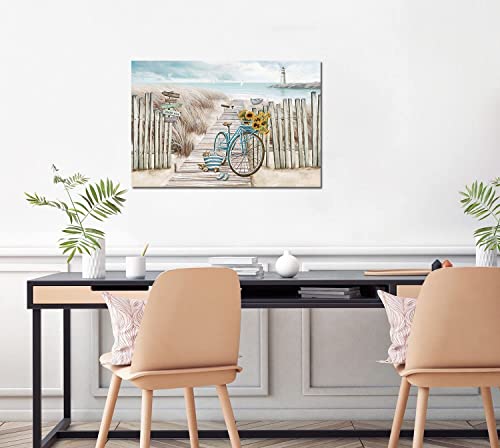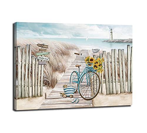 LAIART - تابلوه فني من القماش للتعليق على الحائط مطبوع بصورة بتصميم شاطئ وسياج وممر خشبي ودراجة ومنارة مناسب للحمام (16×24 بوصة)