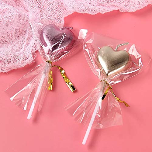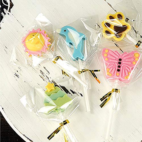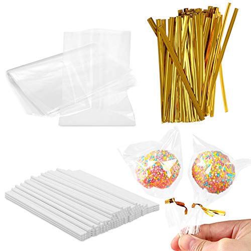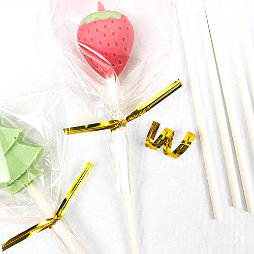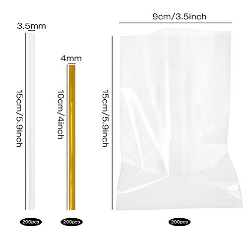 Lainrrew - مجموعة مصاصات كيك بـ200 عصا مصاصة و200 كيس طرد و200 ربطة جولد معدنية ملفوفة لتغليف الحلوى والكيك والشوكولاتة والكوكيز والبوفيه وهدايا الحفلات، 600 قطعة، شفاف