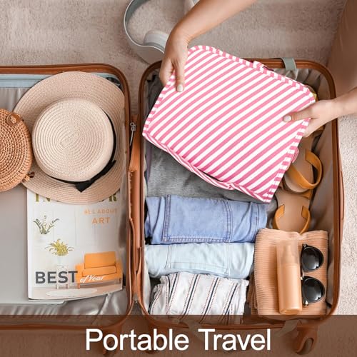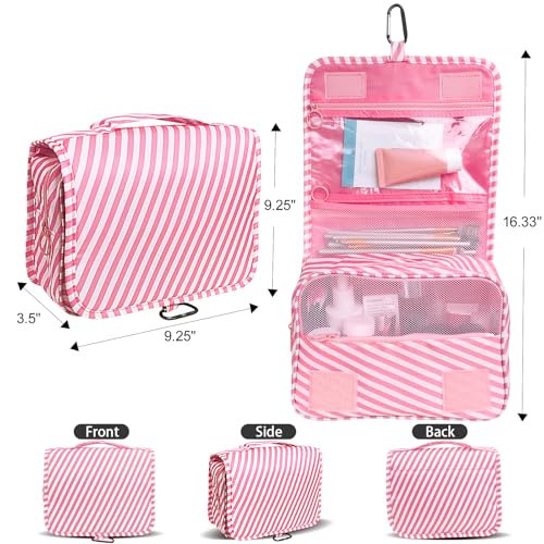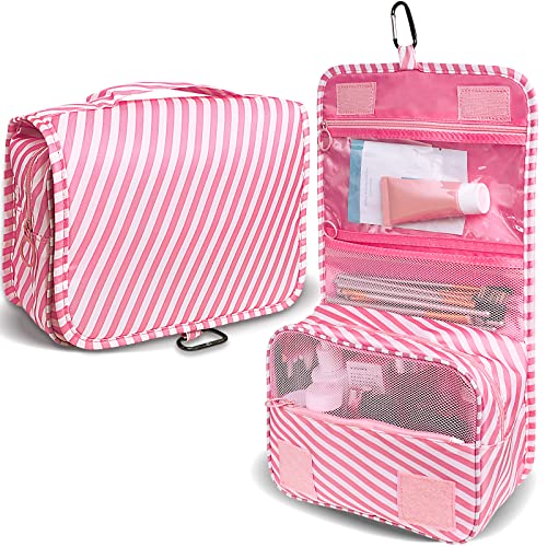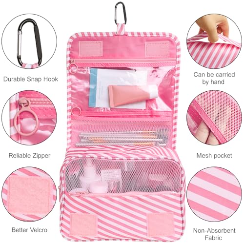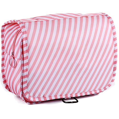 LAKIBOLE - لاكيبول شنطة تنظيم اساسيات السفر للنساء ادوات الزينة معلقة متعددة الوظائف مستحضرات تجميل محمولة مقاومة للماء مخططة وبينك وابيض زهري
