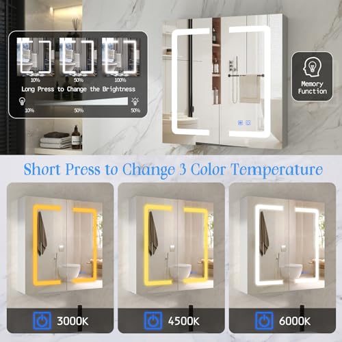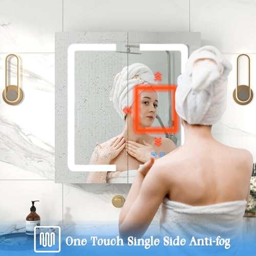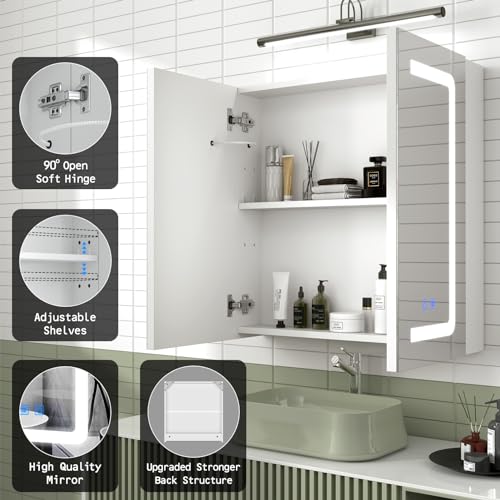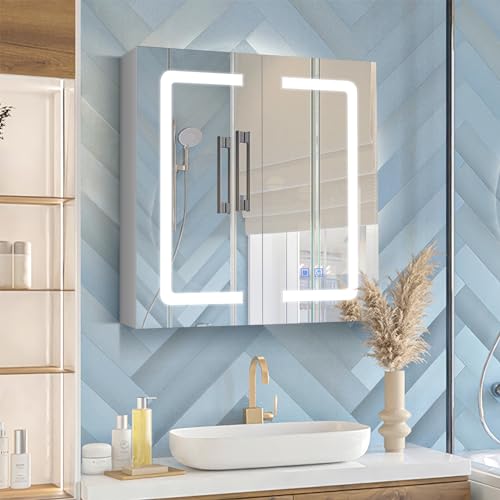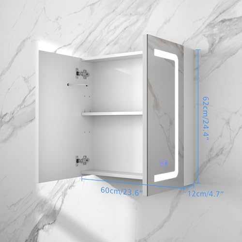 LALAHOO - وحدة تخزين للحمام، مزوّدة بمراية وإضاءة ليد لمقاومة البخار، مع إمكانية تعديل درجة حرارة الإضاءة بثلاثة ألوان ورف داخلي من لالاهو مقاس 60 سم × 62 سم