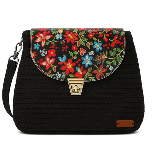 Generic - شنطة كروس كروشيه مصنوعة يدويا للنساء من لاماساتي - شنطة من حبل قطني اسود مع غطاء مزين بالزهور وحزام قابل للفصل