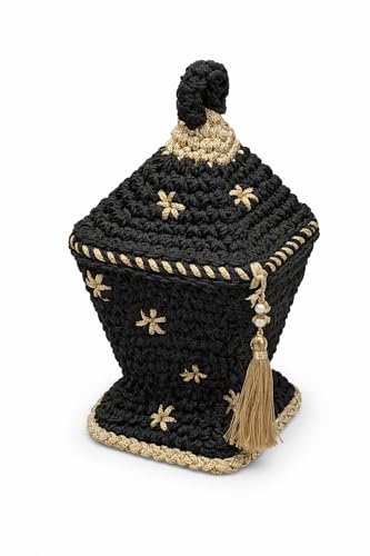 - حرفية لاماساتي مصنوعة يدويًا - كروشيه يدويًا بعناية للحصول على لمسة نهائية فريدة وفاخرة، تصميم أنيق باللونين الأسود والذهبي - ألوان غنية تضيف الفخامة والدفء إلى ديكور رمضان - تضيف لمسة تقليدية راقية على شكل فانوس قائم بذاته - مثالي للطاولات والأرفف وزوايا الصلاة. فكرة هدية رمضان فاخرة - مثالية للمنازل الأنيقة ورمضان الخاص المناسبات