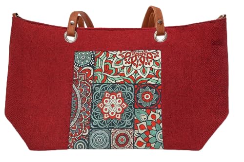 Generic - شنطة يد كبيرة توت مصنوعة يدويا من القماش للنساء من لاماساتي - شنطة كتف كاجوال حمراء مع لوحة قماشية منقوشة ومقابض جلدية
