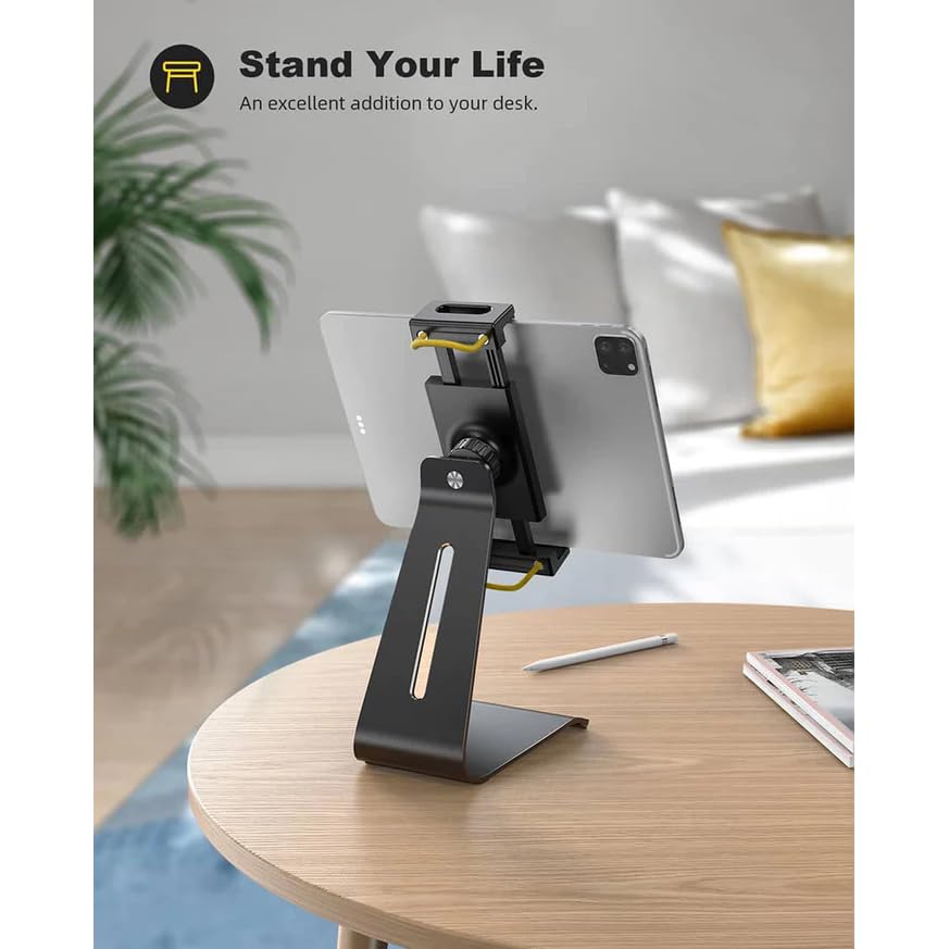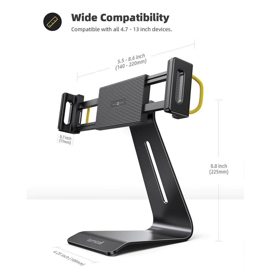 • تصميم قوي ومتين: قاعدة حامل التابلت مصنوعة من معدن عالي الجودة وتتمتع بحواف ناعمة، ما يجعلها قوية جدًا ومستقرة. جزء المشبك الذي يثبت الحامل مصنوع من مادة متينة ومقاومة للتآكل لاستخدام يدوم طويلًا.