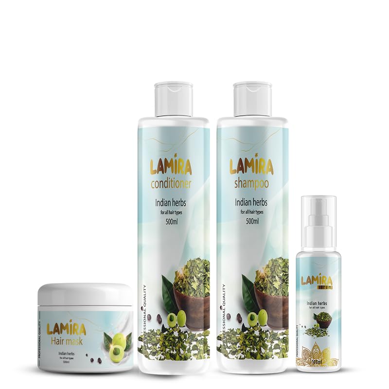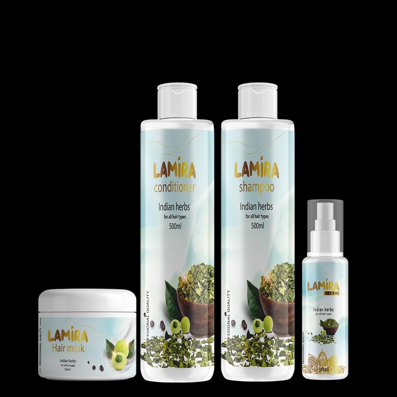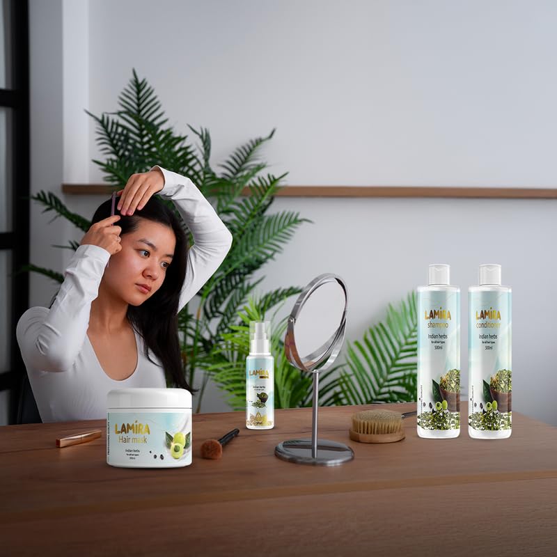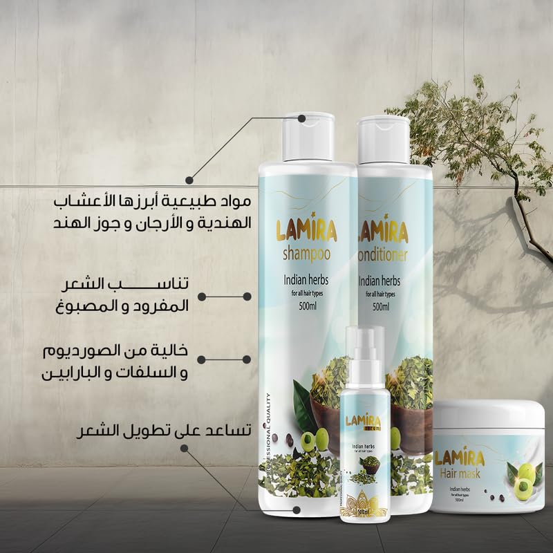 La Mira - مجموعة الاعشاب الهنديه للعناية بالشعر من لاميرا – شامبو، بلسم، ماسك الشعر (500 مل) + سيروم (100 مل) – خالي من السلفات والبارابين – لتطويل الشعر وترطيبه
