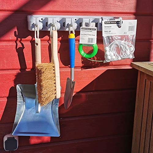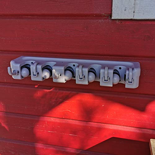 - المواد: بلاستيك، مع 5 مشابك كروية و6 خطافات إضافية لفرشاة اليد والمجرفة وما إلى ذلك. الخطافات قابلة للطي، ويمكن طيها مرة أخرى عند عدم الاستخدام / يمكن تعليق الأجهزة وإزالتها بسهولة / تتضمن مادة التثبيت للتثبيت على الحائط