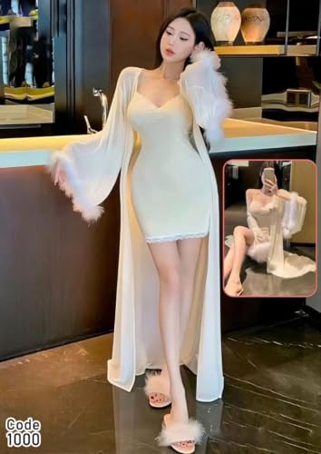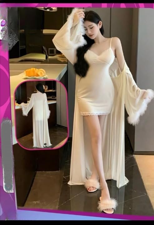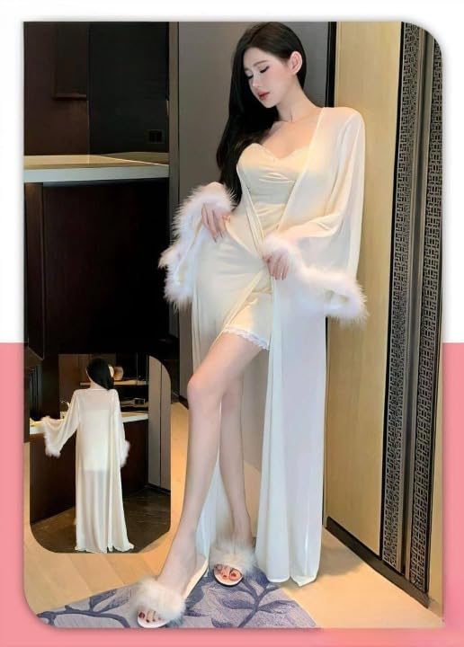 Generic - طقم لانجبرى قميص نوم قصير من خامة الزبدة مطعّم بالدانتيل مع روب طويل من التل الشفاف مزين بالفرو على الأكمام –ثوب نوم أنثوي مثير