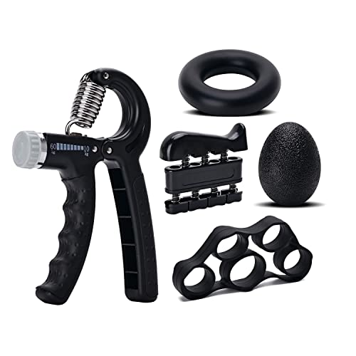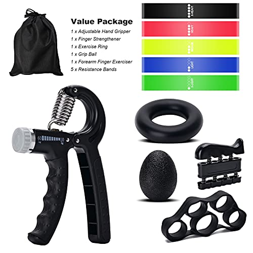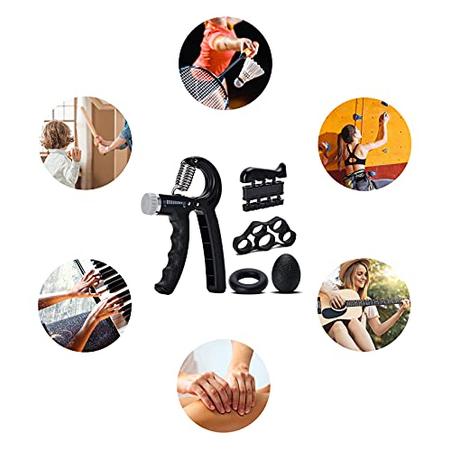 LANGSEN - مجموعة مقوي قبضة اليد من 5 قطع من لانجسين + 5 اشرطة مقاومة، نقالة الاصبع، مقبض يد قابل للتعديل، حلقة تمرين وكرة قبضة للرياضيين، معدات تدريب القوة (اسود)