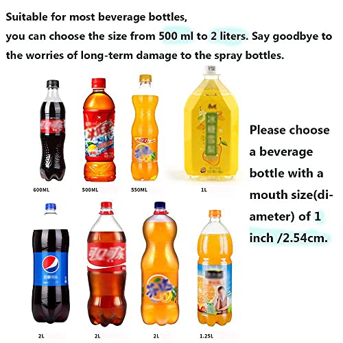 - ★ صديق للبيئة: زجاجات مشروبات قابلة لإعادة التدوير. بشكل عام، من السهل كسر زجاجات الرش بسبب الضغط غير المناسب. إذا كنت تستطيع استخدام زجاجات المشروبات، يمكنك تقليل القمامة وكذلك تكلفة الزجاجات البخ. يناسب الجزء العلوي من البخاخ زجاجات المشروبات بفتحة قدرها 1 بوصة (2.54 سم)، ويناسب المشروبات الغازية بشكل عام وعصائر الفاكهة وزجاجات المشروبات الأخرى.