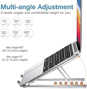 Spaceshoop - ستاند طاولة للاب توب والتابلت ألومنيوم بـ6 زوايا قابلة للتعديل مريح ومطوي متوافق مع ماك بوك واي باد اتش بي لينوفو مقاس من 10 وحتى 15.6 بوصة - لون فضي