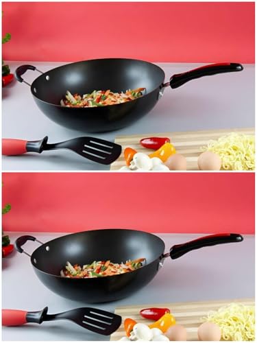 Generic - مقلاة ووك كبيرة عميقة 32 سم مصممة للطبخ العائلي والقلي والقلي والصلصات بعمق واسع وسهل الخلط (اسود × احمر (عبوتان))
