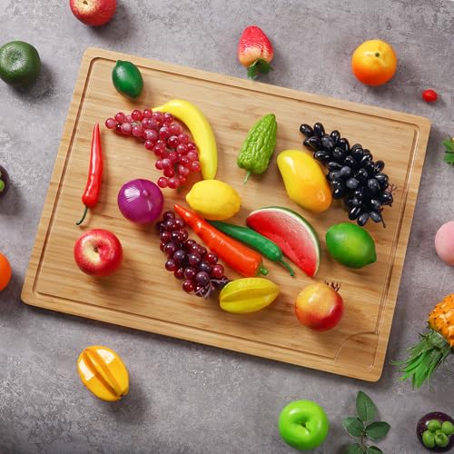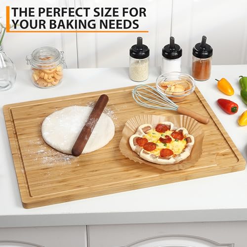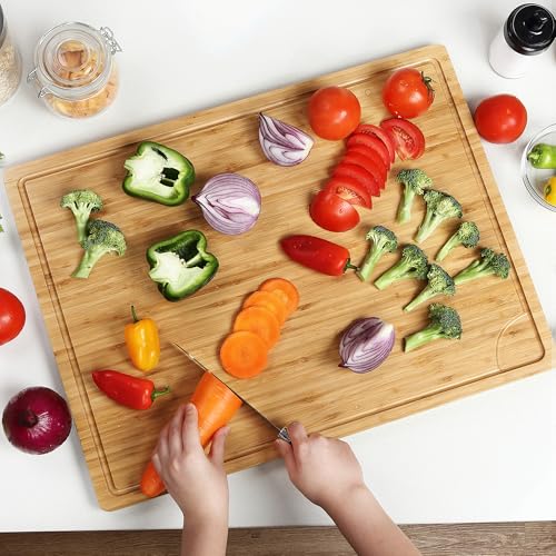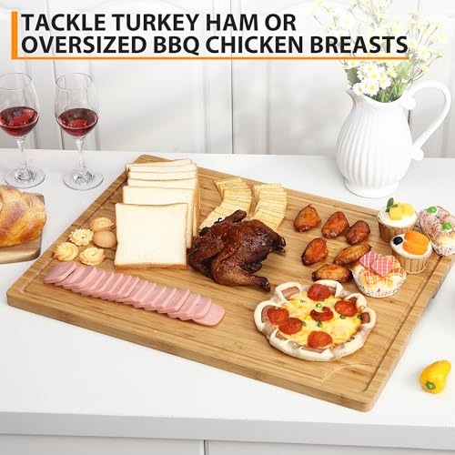 FinerFurnis - لوح تقطيع كبير من الخيزران للمطبخ، لوح تقطيع خشبي شديد التحمل مقاس 24 × 18 انش، لوح تقطيع خشبي قابل للعكس مع اخاديد عصير عميقة، مقابض مدمجة للمطاعم المنزلية