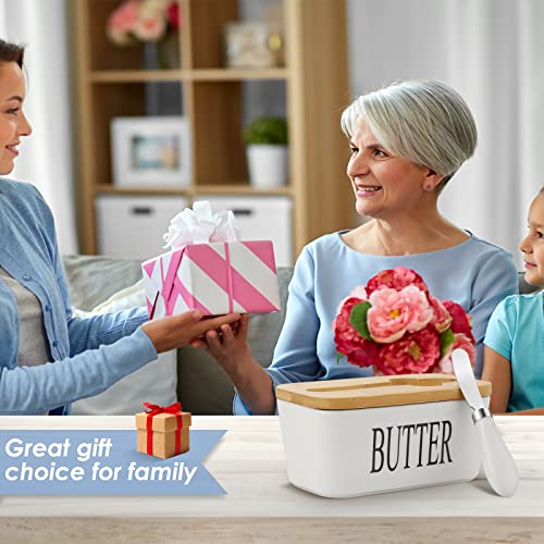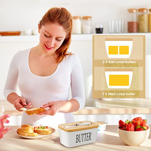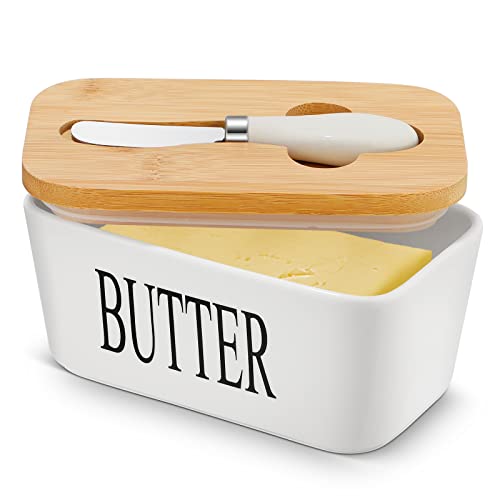 Yitriden - طبق زبدة كبير مع غطاء وسكين، حاوية زبدة بورسلين مقاس أوروبي مع سدادات سيليكون مزدوجة، صندوق زبدة من السيراميك، مثالي للزبدة والمكسرات والجبن، 650 مل، 15 × 9 × 7 سم (أبيض)