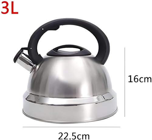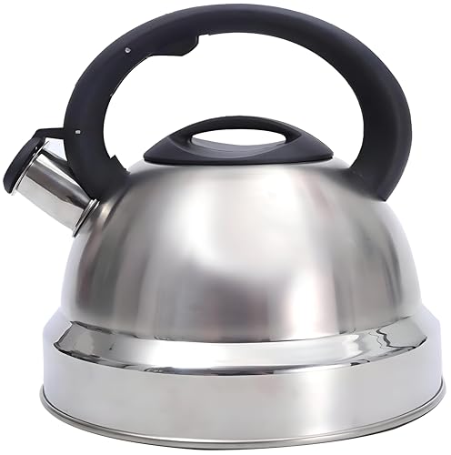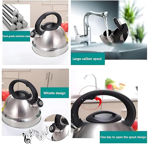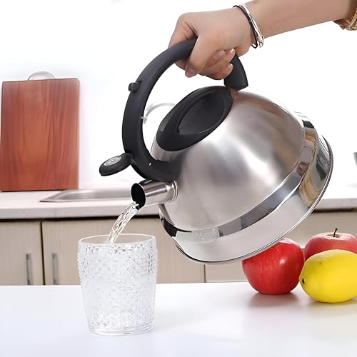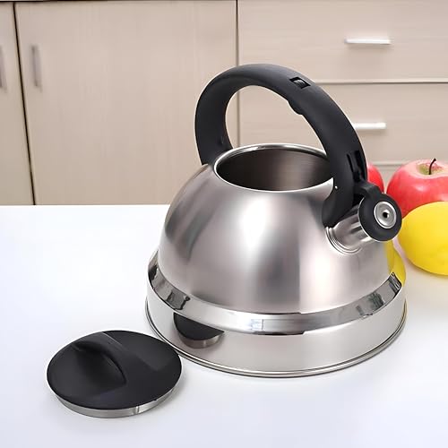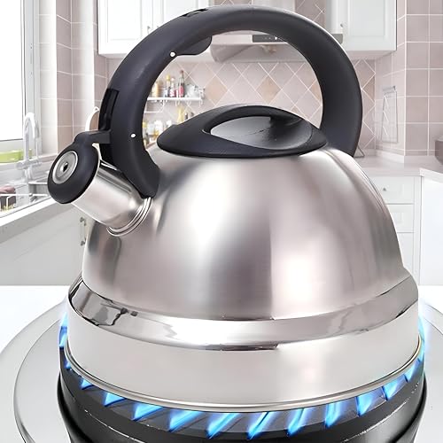 - غلاية من الفولاذ مقاوم للصدأ بسعة 3 لتر مع مقبض مقاوم للحرارة وصفارة دقيقة تصدر صوتًا عندما يصل الماء إلى درجة الغليان، مما يساعدك على الاستمرار في التركيز على المهام أو الأفلام أو الموسيقى