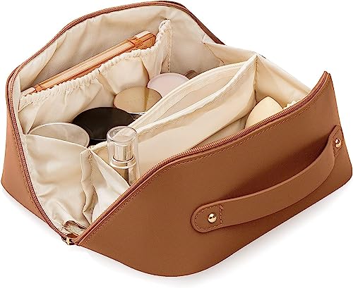Hatieo - شنطة مستحضرات تجميل للسفر بسعة كبيرة مكياج محمولة من جلد البولي يوريثين سفر للسيدات مقاومة للماء تخزين متعددة الوظائف للنساء والفتيات بني هاتيو