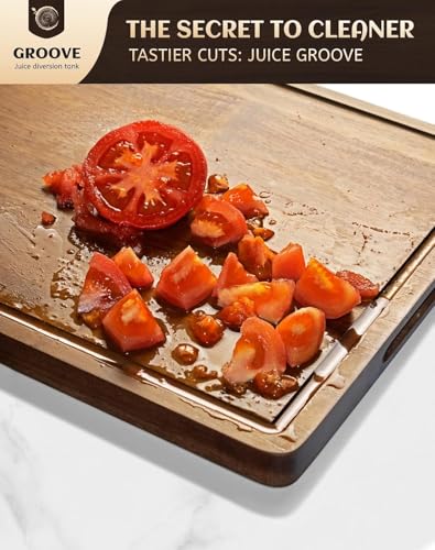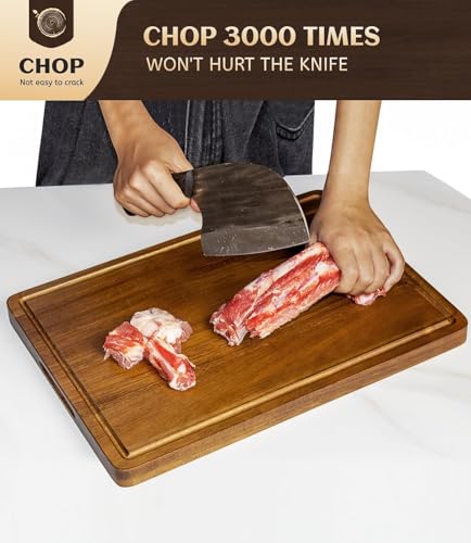 - مصنوع ليدوم طويلاً من خشب الأكاسيا الفاخر: مصنوع بدقة من خشب الأكاسيا القديم عالي الجودة، والمعروف بمتانته وقوته الاستثنائية. يبلغ سُمك لوح التقطيع الخاص بنا 2.5 سم، مما يضمن رفيق مطبخ قوي ويدوم طويلاً. مصمم لتقطيع عالي التحمل، فهو يعمل على إطالة حدة سكين الطهاة بشكل كبير، مما يقلل الحاجة إلى الشحذ بنسبة تصل إلى 30%.