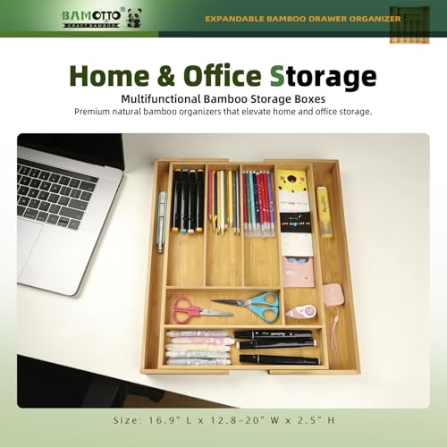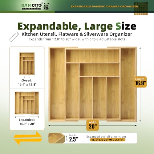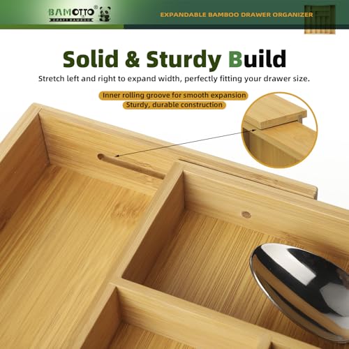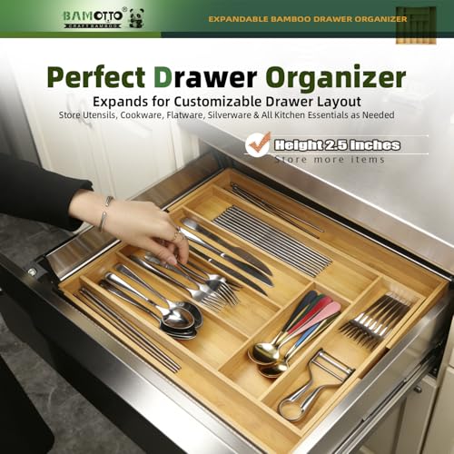 BAMOTTO CRAFTBAMBOO - منظم أدراج كبير قابل للتوسيع من البامبو - منظم أدوات المائدة والأواني الفضية للمطبخ - منظم أدراج خشبي قابل للتعديل للسكاكين في المطبخ وغرفة النوم وغرفة المعيشة (32 سم إلى 51 سم × 43 سم)