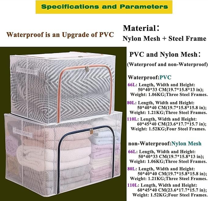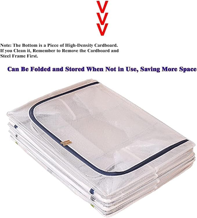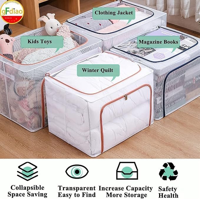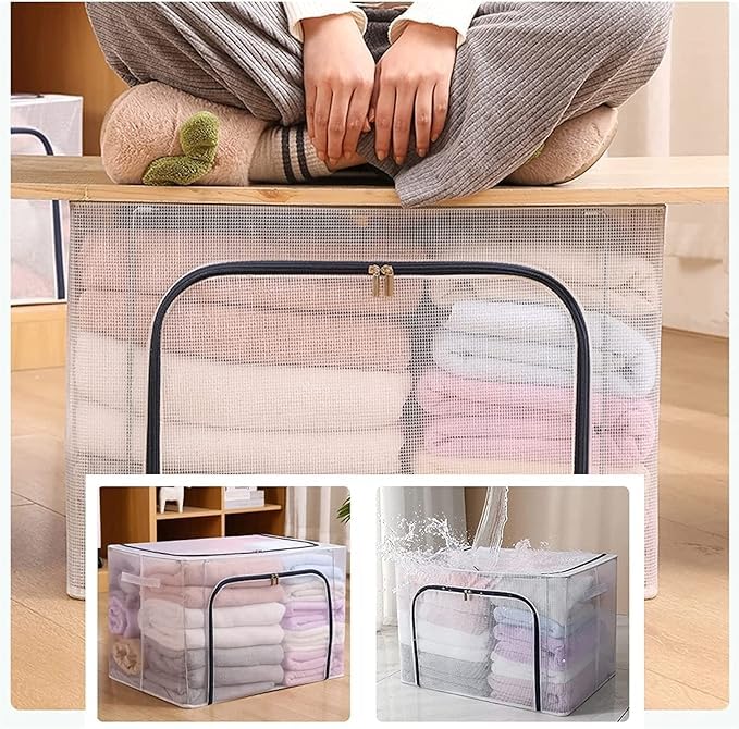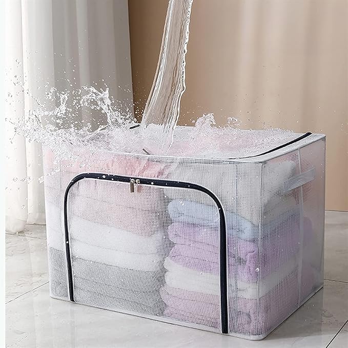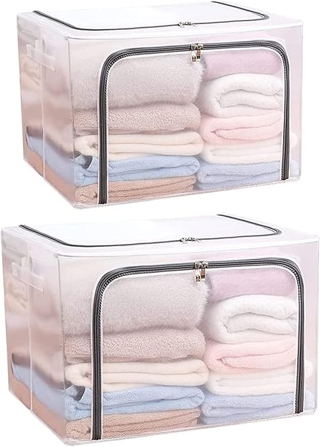 Generic - صندوق تخزين كبير قابل للطي بإطار من الصلب بتصميم قماش شفاف وإغلاق بسوستة ومقابض معززة، مناسب لتنظيم الملابس والألحفة والدواليب، سعة 80 ل
