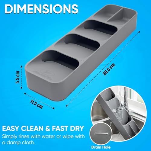 - الأبعاد: منظم أدوات مائدة بسعة كبيرة بقياس 39.5 سم (طول) و11.5 سم (عرض) و5.5 سم (عمق)، مثالي لأدراج المطابخ القياسية.