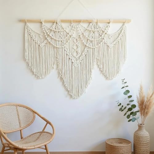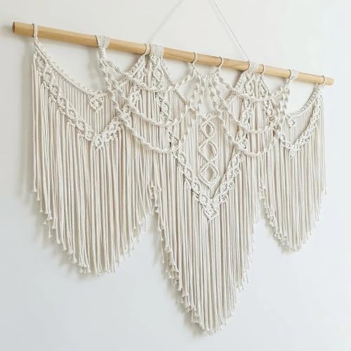 Generic - مكرمية كبيرة للتعليق على الحائط من نسيج محبوك من القطن بنمط بوهو مع قضيب من البامبو مزخرفة ومصنوعة يدويا مناسبة كديكور منزلي بوهيمي عصري، لون كريمي أبيض