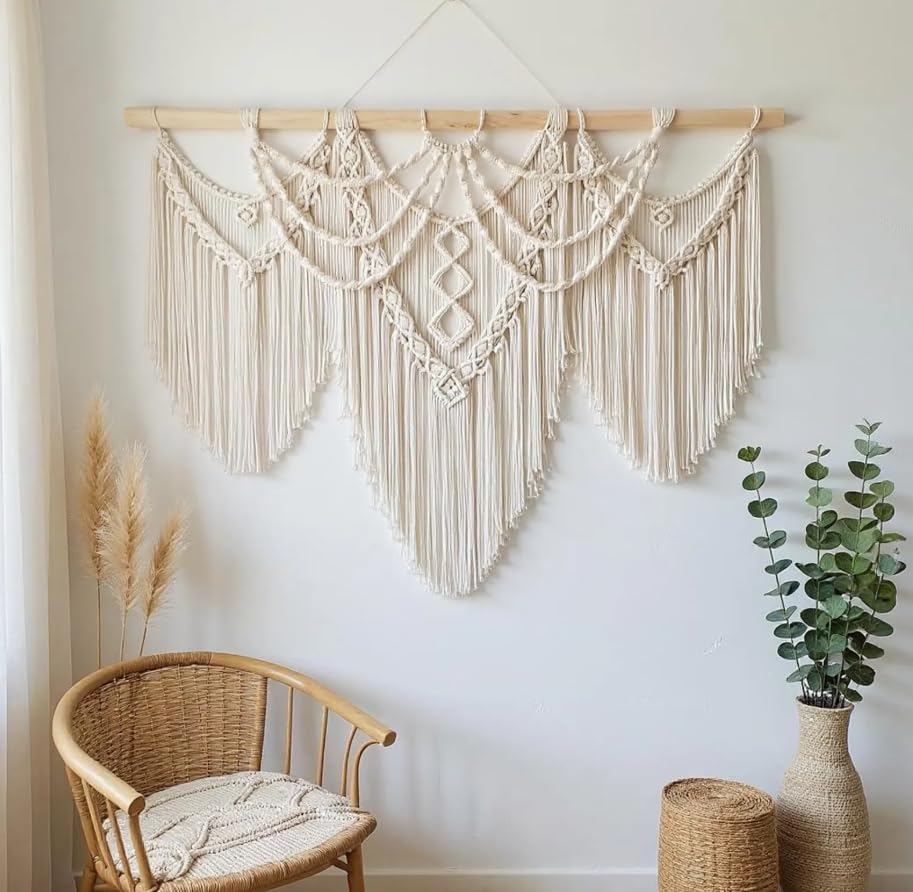 - قطعة مميزة تمنحكِ مظهرًا أنيقًا: تخلق المكرمية الجدارية الكبيرة نقطة محورية ملفتة للنظر، مثالية لغرف المعيشة، وغرف النوم، والمداخل، أو فوق الأثاث.