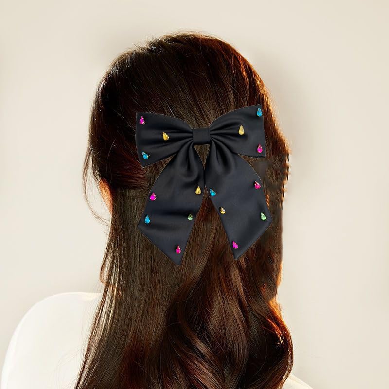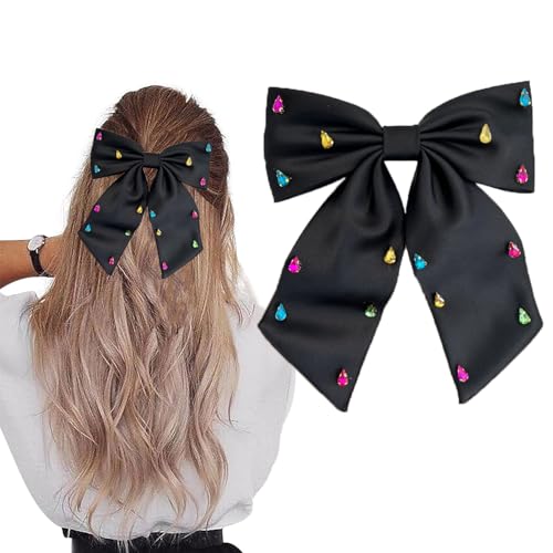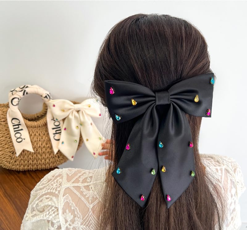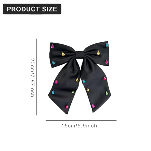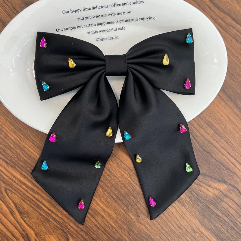BESALECK - فيونكات شعر كبيرة من الساتان الحريري - ذيل طويل مرصع باحجار الراين، مشابك شعر انيقة من الشيفون، اكسسوارات شعر للنساء والفتيات، هدايا الزفاف والكريسماس والعطلات (اسود)