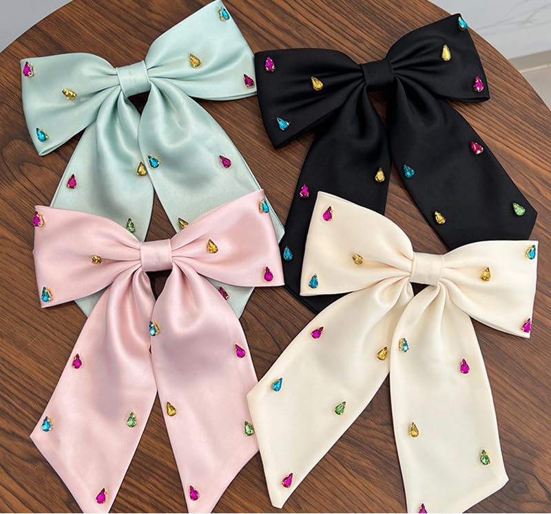 - ربطات شعر كبيرة من الساتان الحريري - تتميز بتصميم فيونكة كبيرة مع تفاصيل من حجر الراين اللامع ومشبك إغلاق معدني، مما يمنحك جاذبية إضافية. أضيفي لمسة من الأناقة إلى تسريحة شعرك مع مشابك الشعر الجميلة هذه المرصعة بالجواهر، فهي مزيج مثالي من الفخامة والأناقة