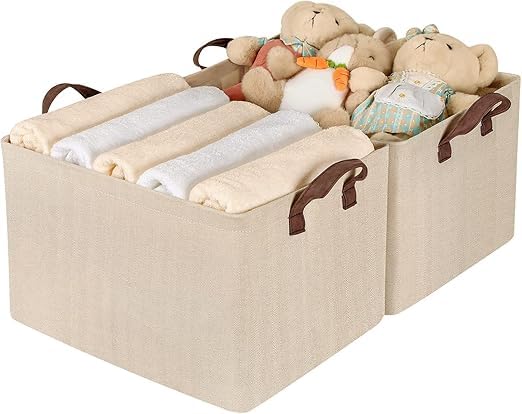 Generic - صناديق تخزين كبيرة بمقابض لتنظيم الالعاب والبطانيات، مجموعة من قطعتين بلون بيج