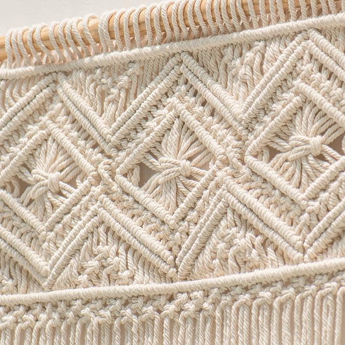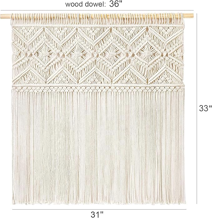 - المقاس التقريبي: 31 بوصة عرض × 33 بوصة ارتفاع (الارتفاع: من أعلى إلى نهايات أطول شراشيب). العرض الإجمالي: 36 انش (حجم وتد الخشب). يرجى ملاحظة: نظرًا لأن المكرمية منتج منسوج يدويًا، فقد يكون هناك اختلاف بمقدار 1 إلى 2 انش في المقاس الموجود بينهما.