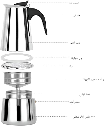 - ماكينة تحضير الاسبريسو هذه مصنوعة من الستانلس ستيل عالي الجودة، مما يوفر المتانة ومقاومة للصدأ والتآكل. يضمن استخدام مواد آمنة غذائيًا عدم وجود روائح كريهة تؤثر على المذاق النقي لقهوتك، مما يسمح لك بالاستمتاع بكل رشفة دون تنازلات.