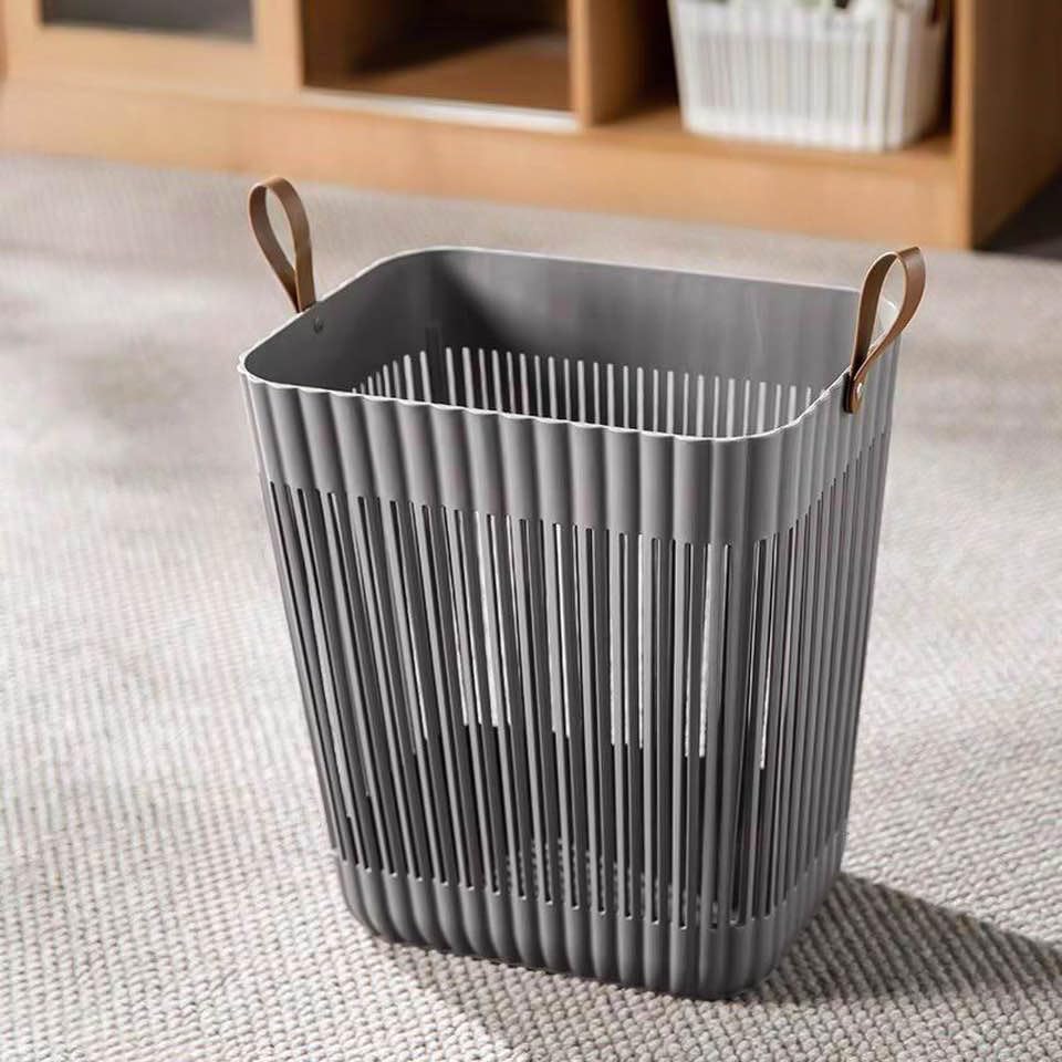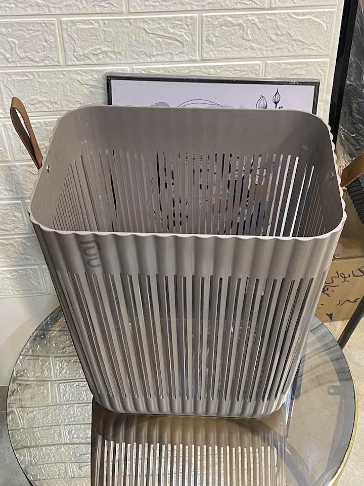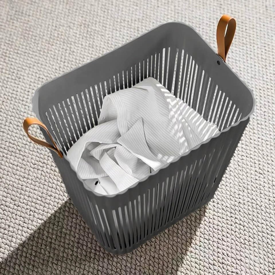 - تصميم عصري: سلة غسيل رمادية أنيقة مع مقابض جلدية جانبية تضيف لمسة جمالية لأي مكان