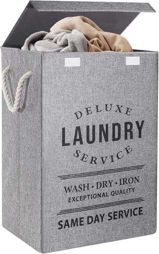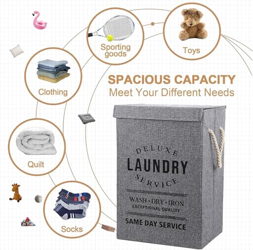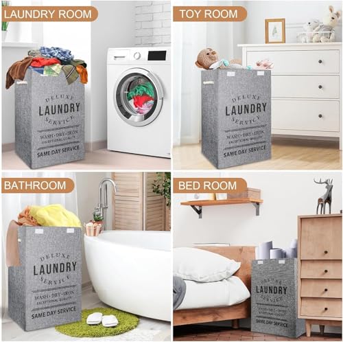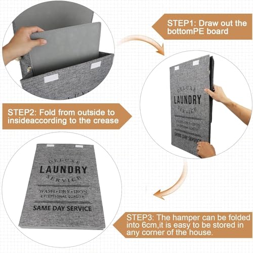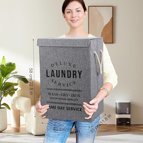 Generic - سبت غسيل، سلة تخزين قماش مع مقابض، 49 × 36 × 34 سم، تصميم قابل للطي، طباعة نص بنمط عتيق، لتنظيم الملابس (رمادي)