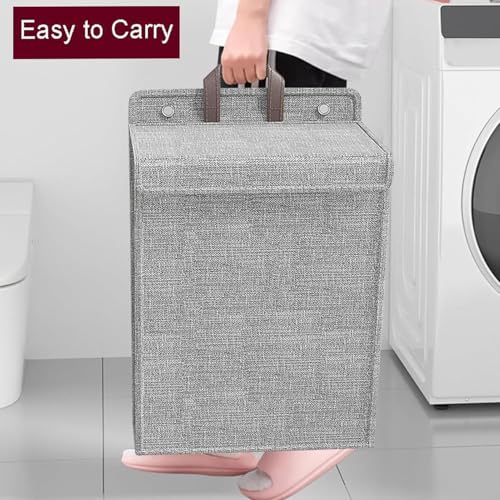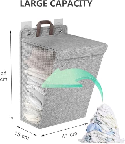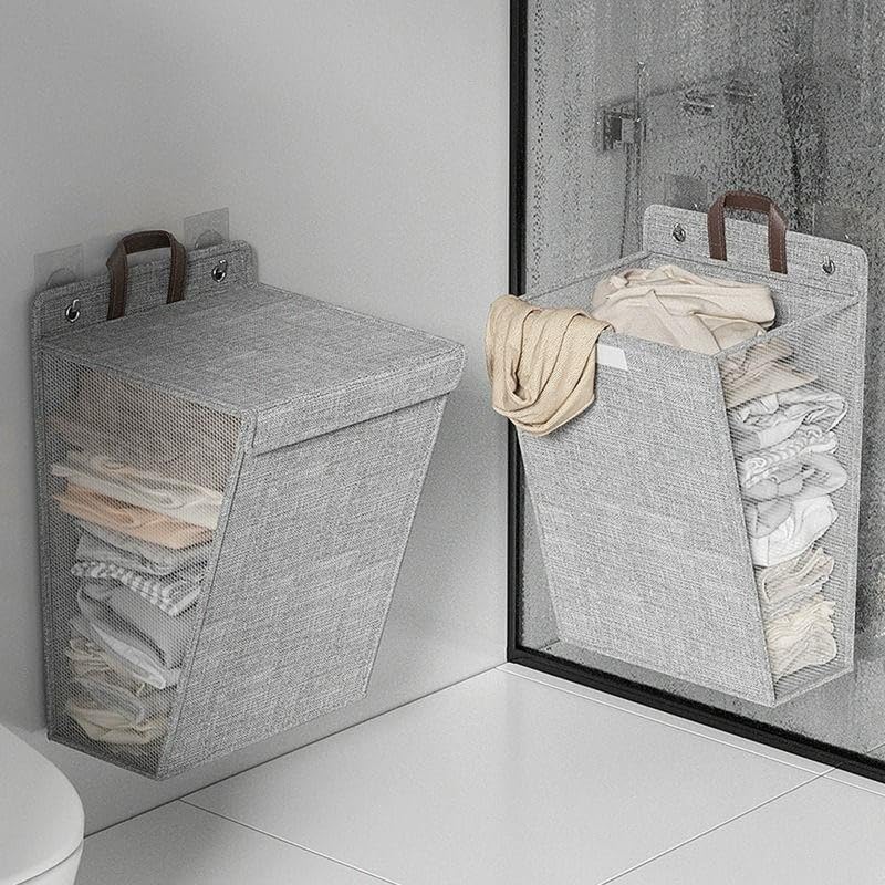 Spaceshoop - سبت غسيل مع غطاء، سلة غسيل كبيرة قابلة للطي والتعليق بمقبض تثبت على الحائط للحمام بدون تركيب (قطعة واحدة)