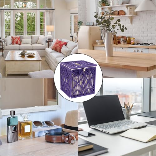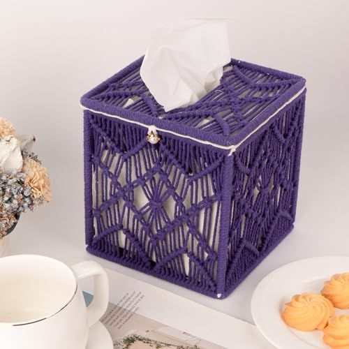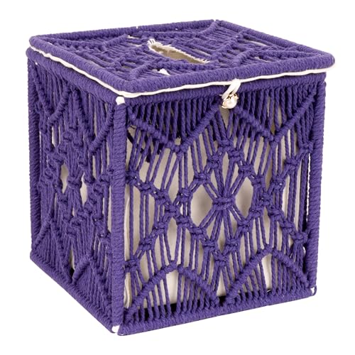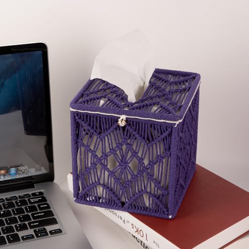 Philo Fun - غطاء علبة مناديل مربع من المكرمية، حامل مناديل بنمط بوهيمي، صندوق تخزين مناديل بتصميم ساحلي للنساء، لافندر أرجواني
