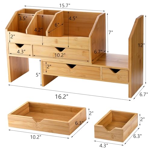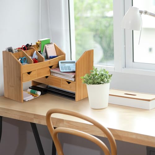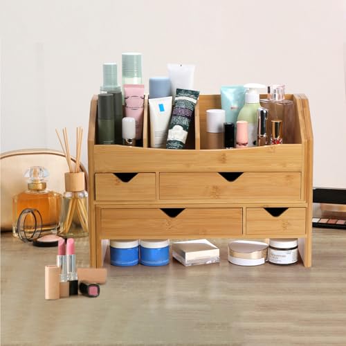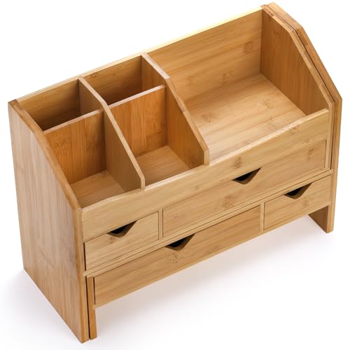 Lawei - منظم مكتب من البامبو مع حامل ملفات قابل للتعديل من لاوي، صندوق تنظيم صغير لسطح الترابيزة مع 4 أدراج للمكياج والرسائل والأقلام ومستلزمات المكتب المنزلية، 3 طبقات، مجمع بالكامل