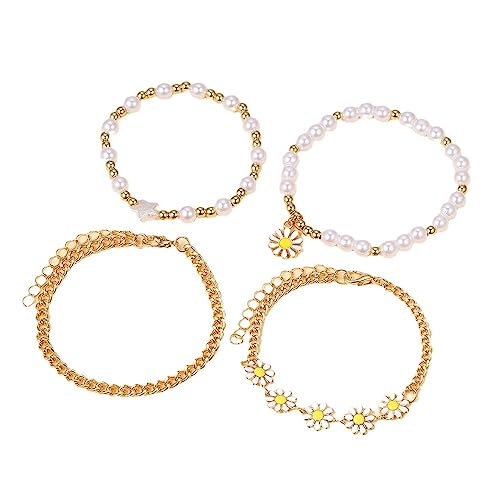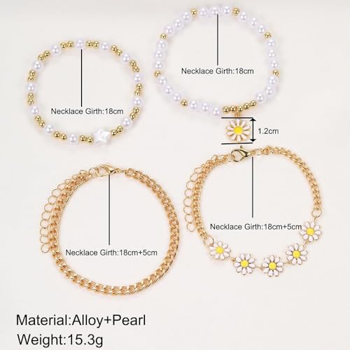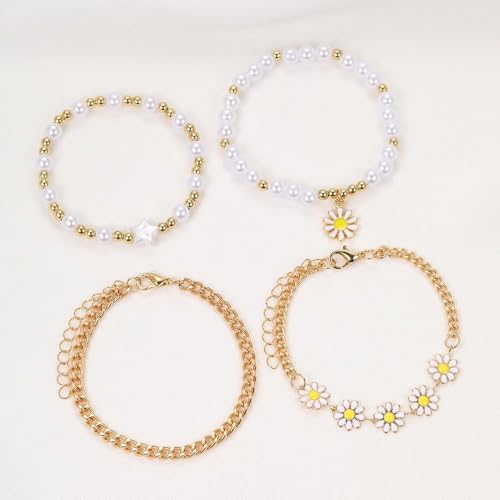 fashion mania - مجموعة اساور مطاطية من اللؤلؤ بطبقات وزهرة الاقحوان وقلب ونجمة قابلة للتعديل
