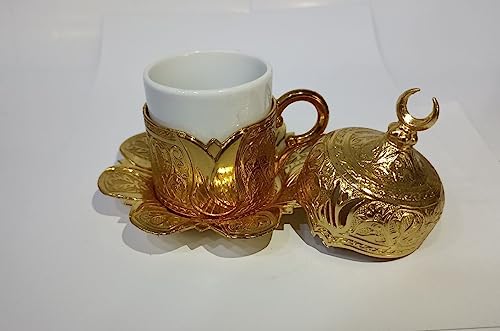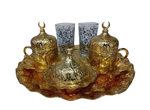 - مجموعة تقديم قهوة اسبريسو فريدة من نوعها على الطراز العثماني الشرقي مكونة من 13 قطعة لشخصين (2 كوب بورسلين ديميتاس، 2 حامل أكواب نحاسي، 2 غطاء، 2 صحون، 2 كوب زجاجي للمياه، 1 صينية، 1 طبق تقديم بهجة السكر وغطاء)